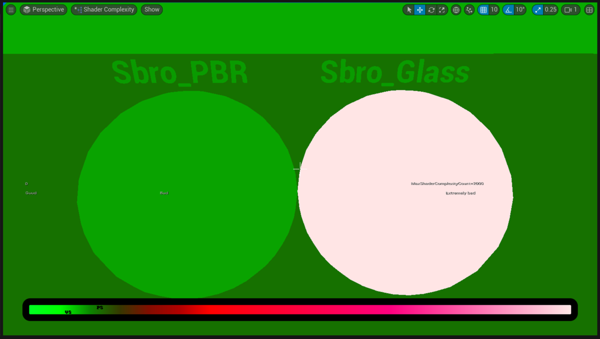 Shader Complexityでパフォーマンスを見てみると、右側のSbro_Glassマテリアルの処理負荷が高いことがわかります。